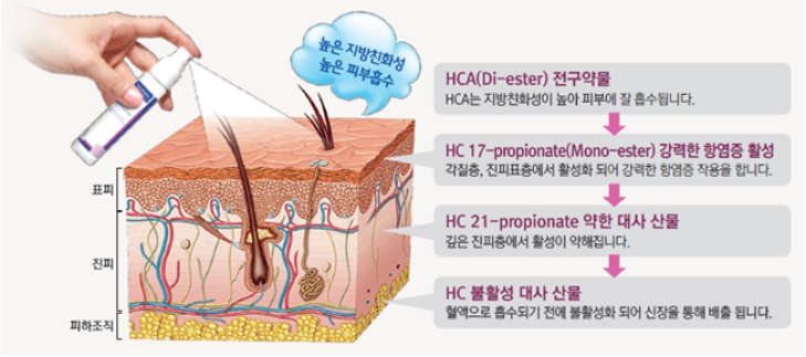 또한 HCA성분은 깊은 진피층으로 갈수록 불활화되어 신장으로 배출되기 때문에 스테로이드 전신 순환에 의한 부작용이 크게 감소합니다.
